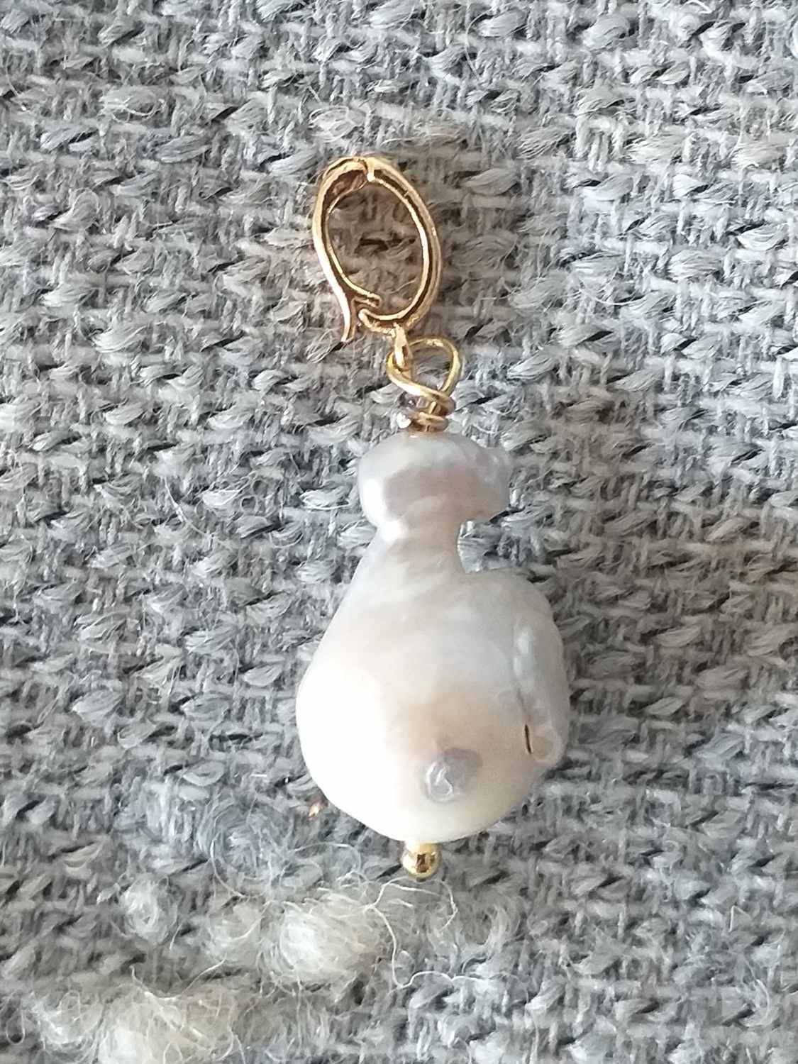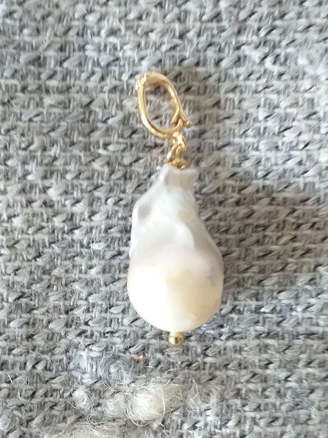 Lille barok perlevedhæng som kan sættes på en halskæde. Vedhænget kan enten skubbes på en tynd kæde eller åbnes og klikkes på fx. en perlekæde. Perlerne er barokke, så de har helt deres eget udtryk. Den lille klips, som perlen sidder i er forgyldt messing.