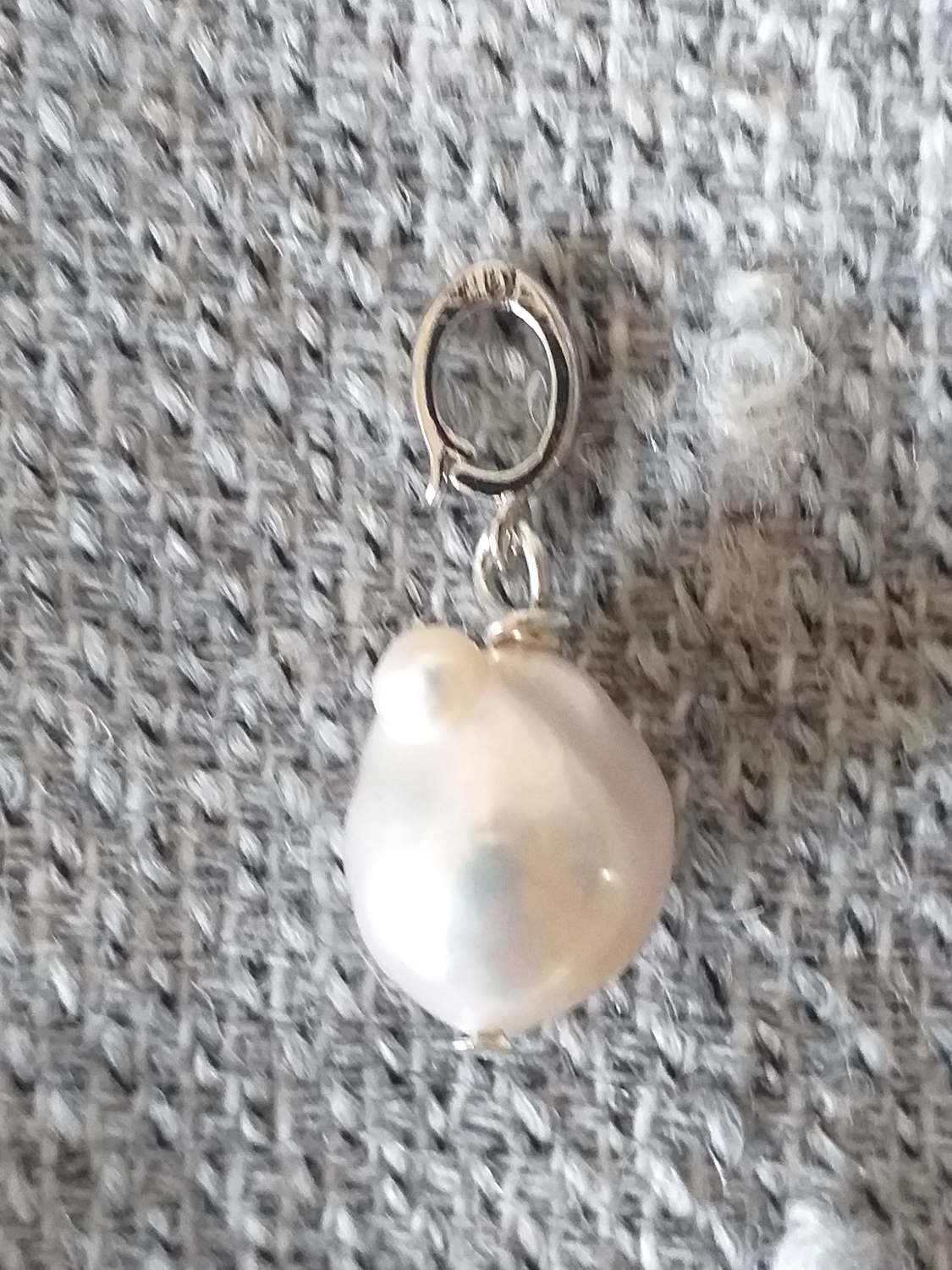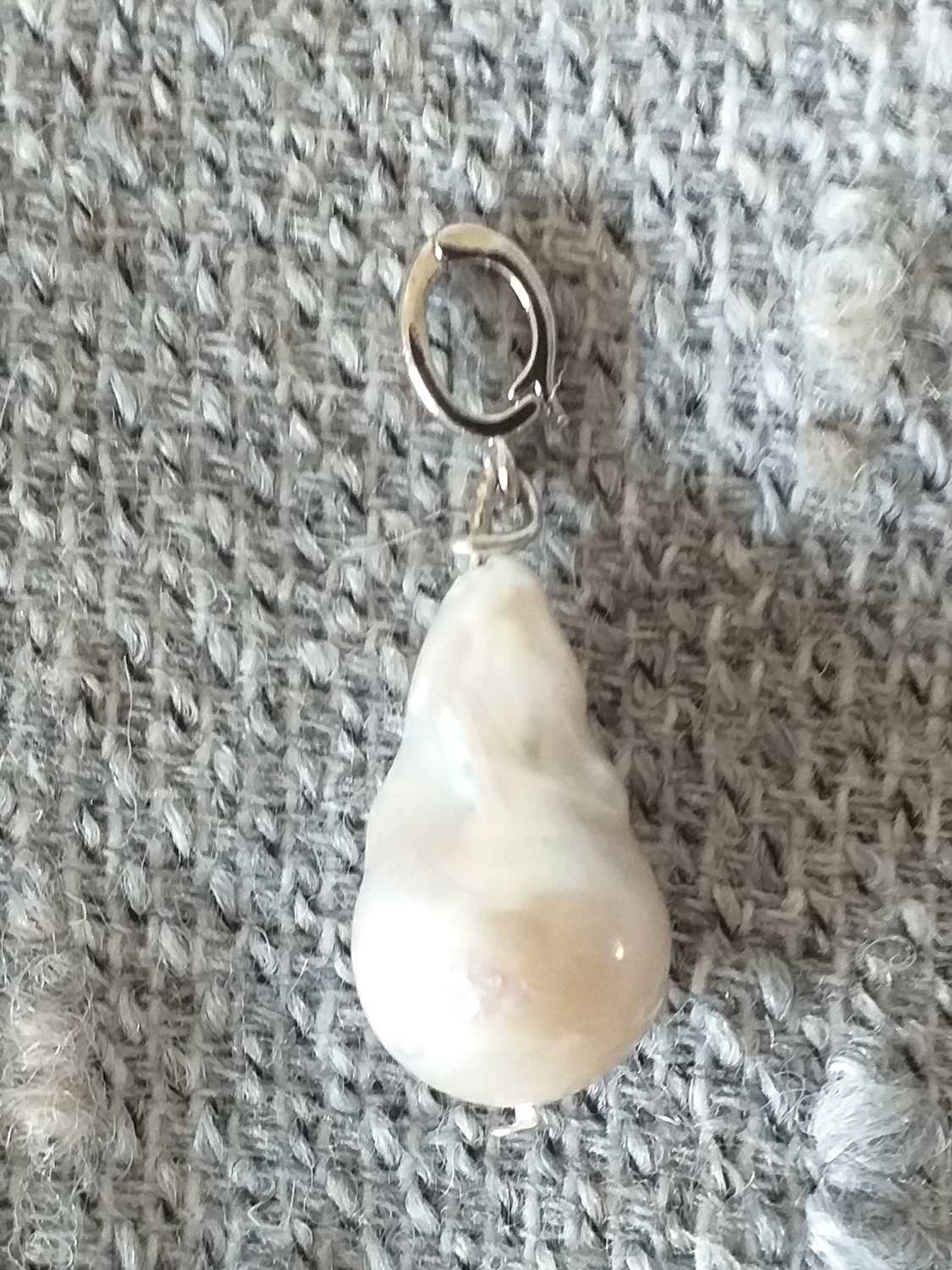 Lille barok perlevedhæng som kan sættes på en halskæde. Vedhænget kan enten skubbes på en tynd kæde eller åbnes og klikkes på fx. en perlekæde. Perlerne er barokke, så de har helt deres eget udtryk. Den lille klips, som perlen sidder i er sølvfarvet messing.